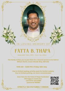 In loving Memory of Late Fatta Thapa (10 Jan 1972-1st July 2024) Time: 11:30am-12:00pm Venue: